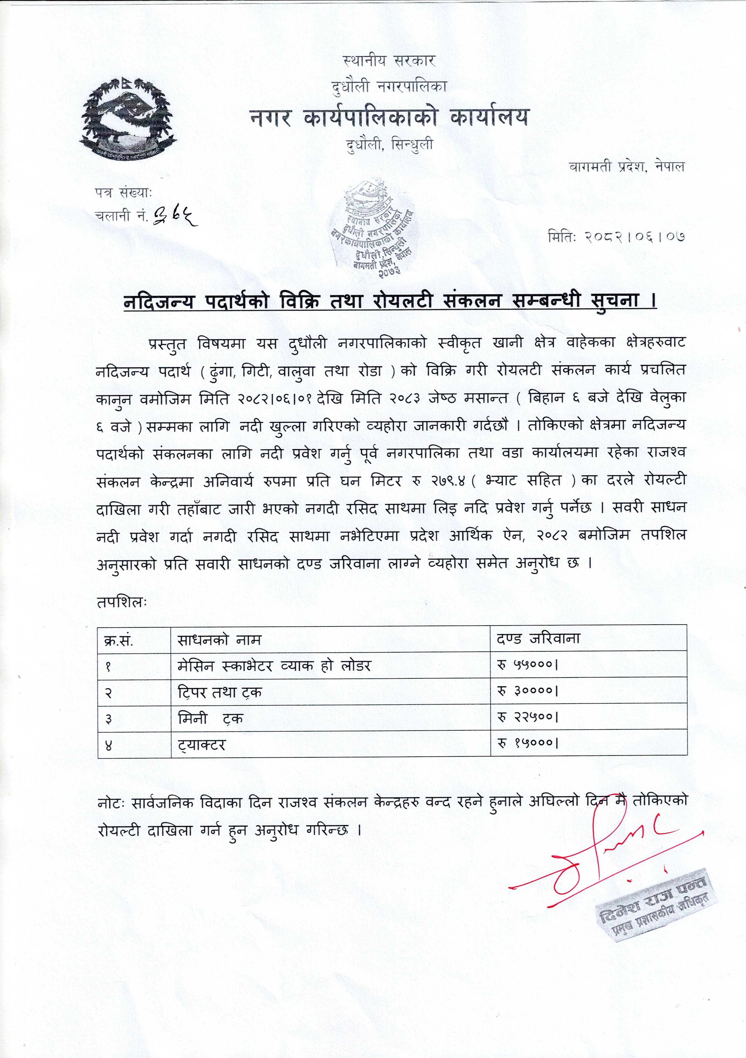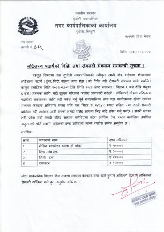 नदिजन्य पदार्थको बिक्रि तथा रोयल्टी संकलन सम्बन्धी सूचना।