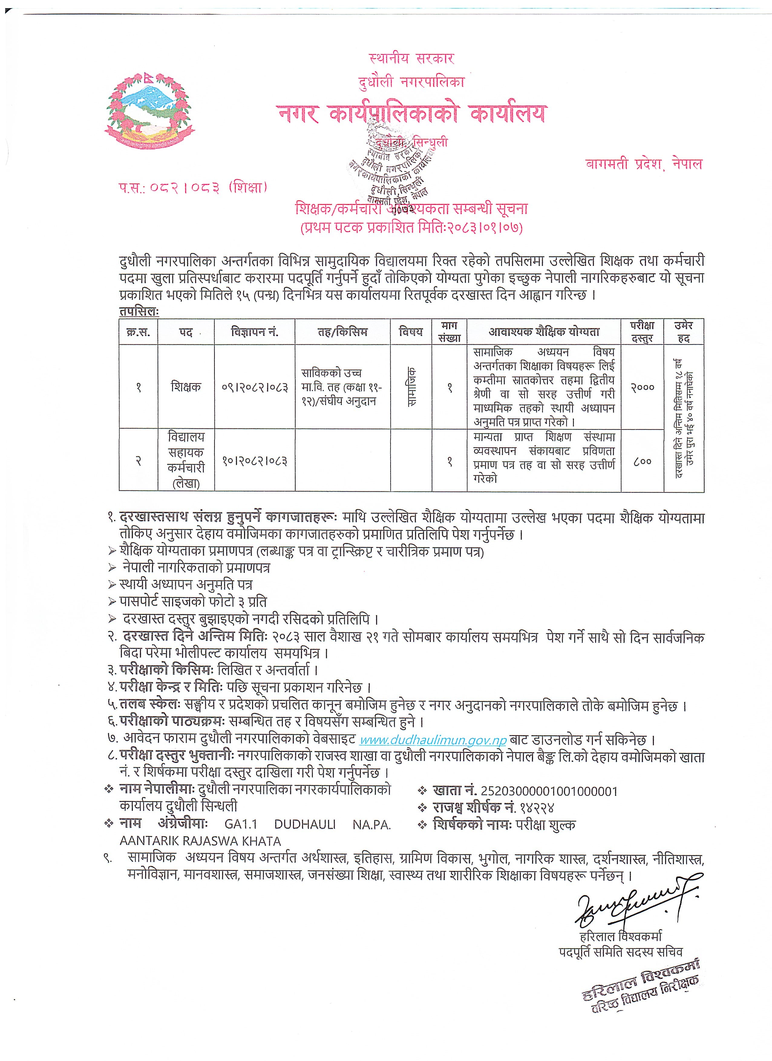 शिक्षक/कर्मचारी आवश्यकता सम्बन्धी सूचना ।