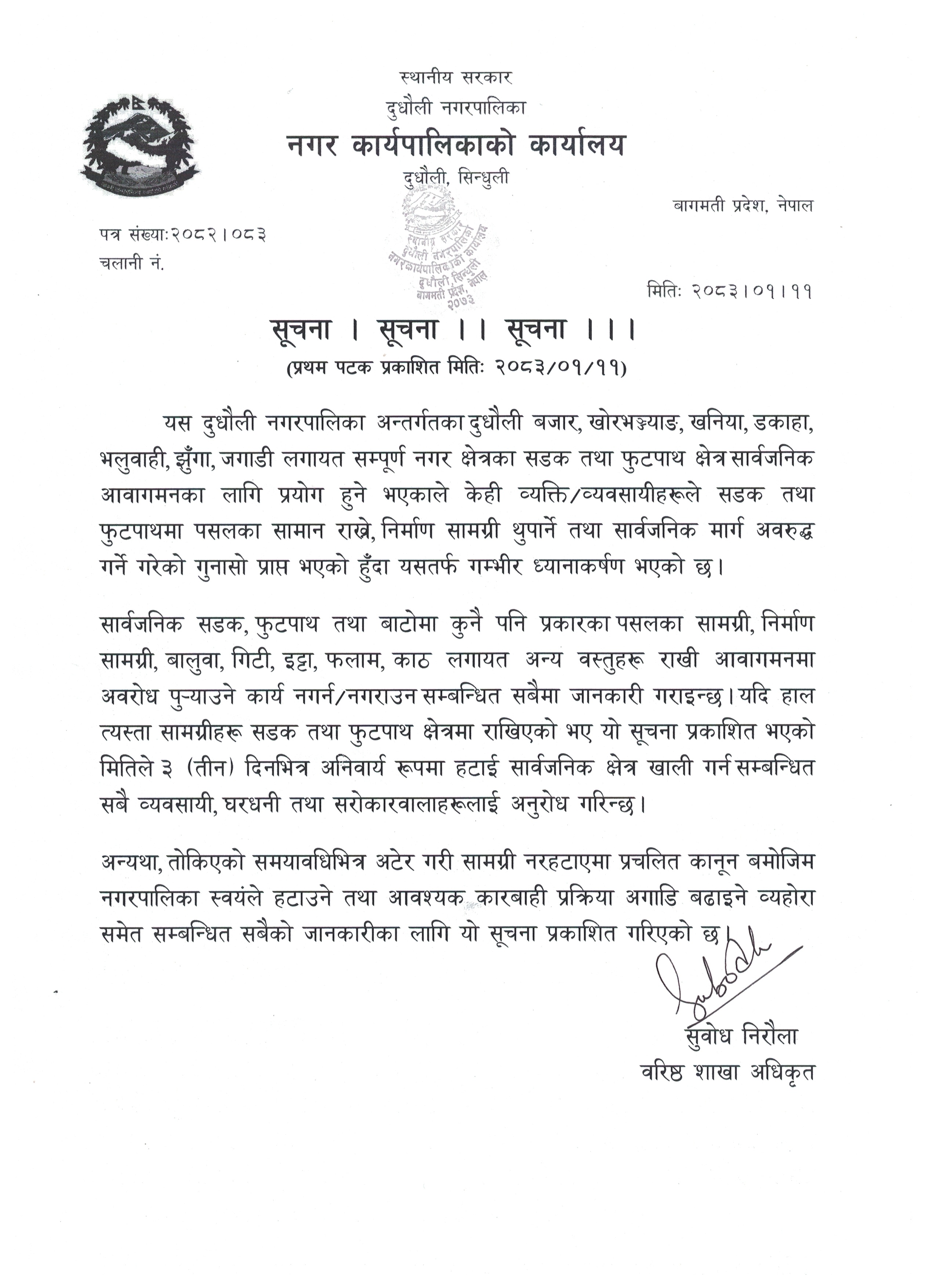 » सार्वजनिक सडक फुटपाथ तथा बाटोमा कुनै प्रनि सामाग्रि नराख्न सम्बन्धित सबैमा सूचना ।