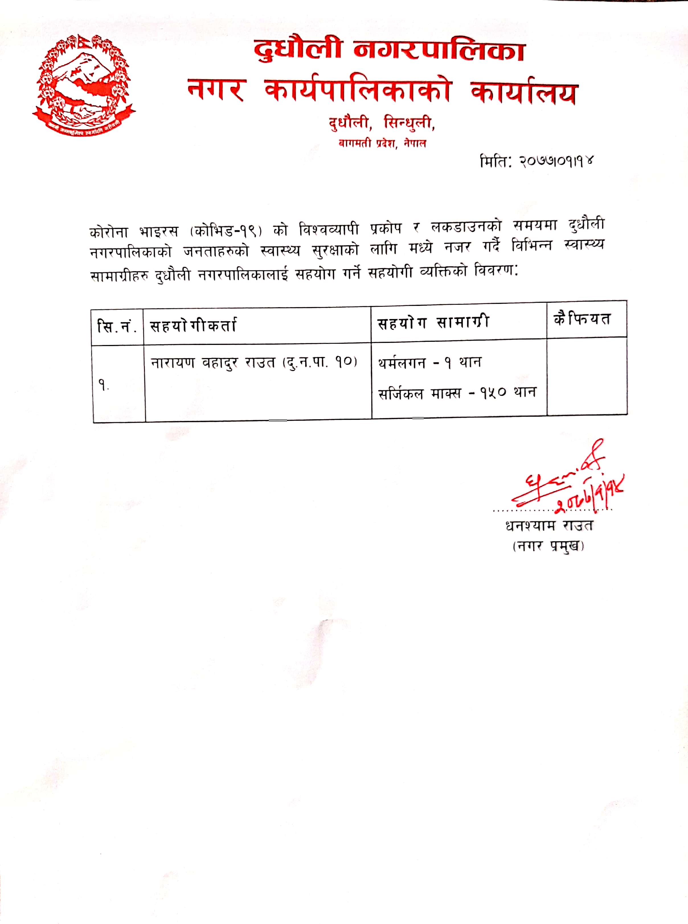 » दुधौली नगरपालिकाको कोरोना (COVID-19) प्रकोप व्यवस्थापन कोषमा स्वास्थ्य सामग्रीहरू सहयोग गर्ने सहयोगीहरुको थप विवरण |
