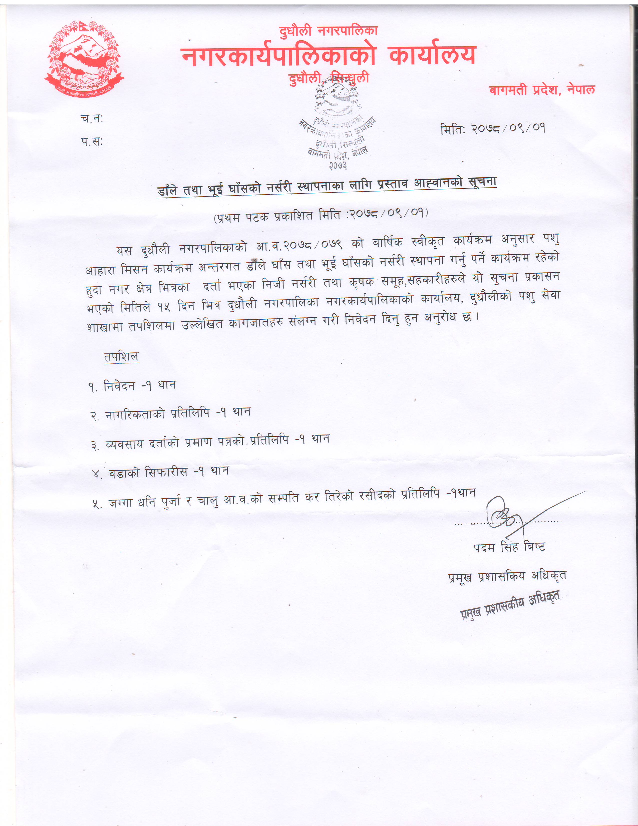 डाँले तथा भुई घाँसको नर्सरी स्थापनाका लागि प्रस्ताव आव्हानको सूचना ।