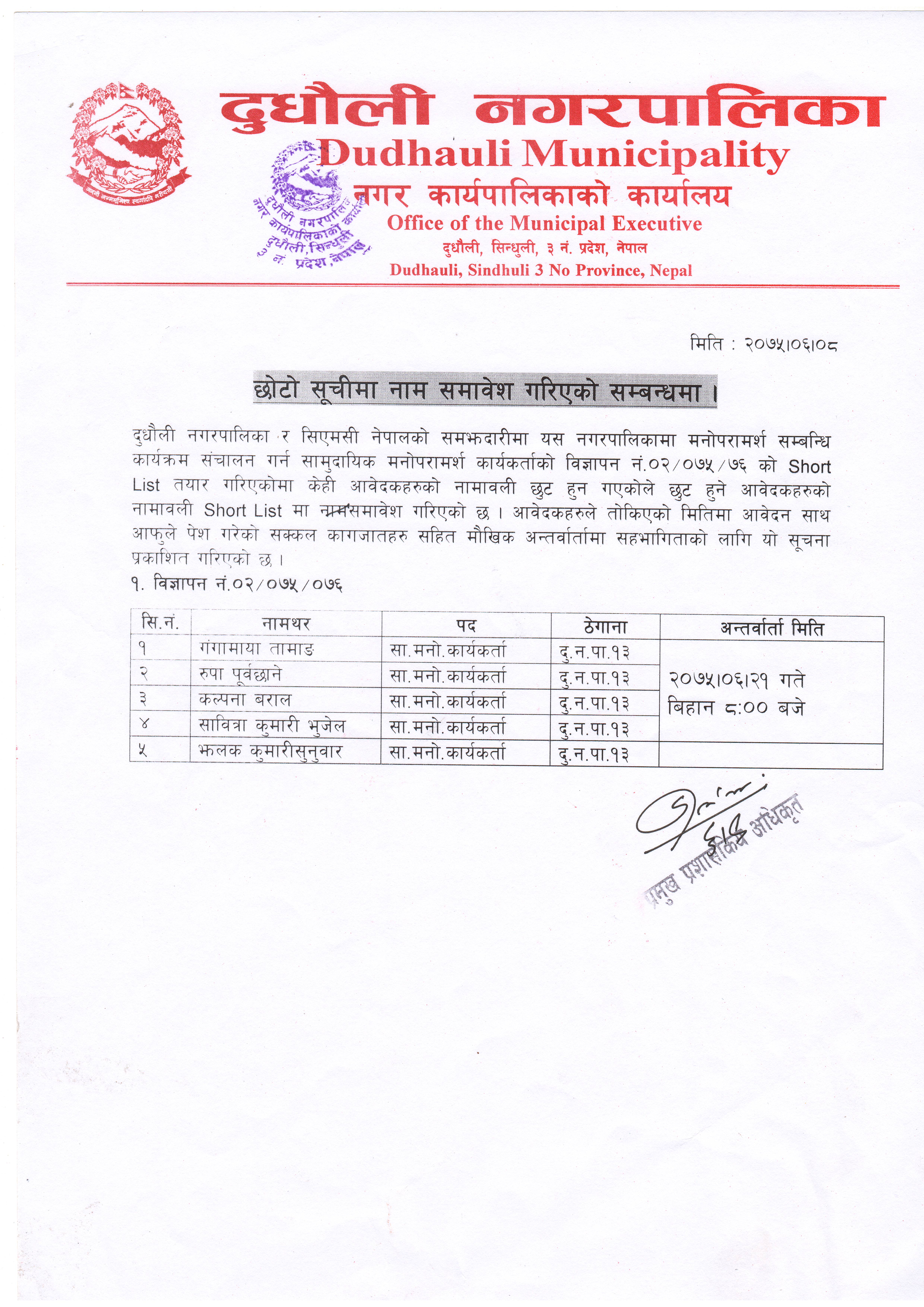 तल Supporting Documents मा राखिएको सामुदायिक मनोपरामर्श कार्यकर्ताको छोटो सुच्नीमा छुट नामावली समावेश गरिएको सूचनाको pdf file डाउनलोड (Download) गरी पढ्न सक्नु हुनेछ।