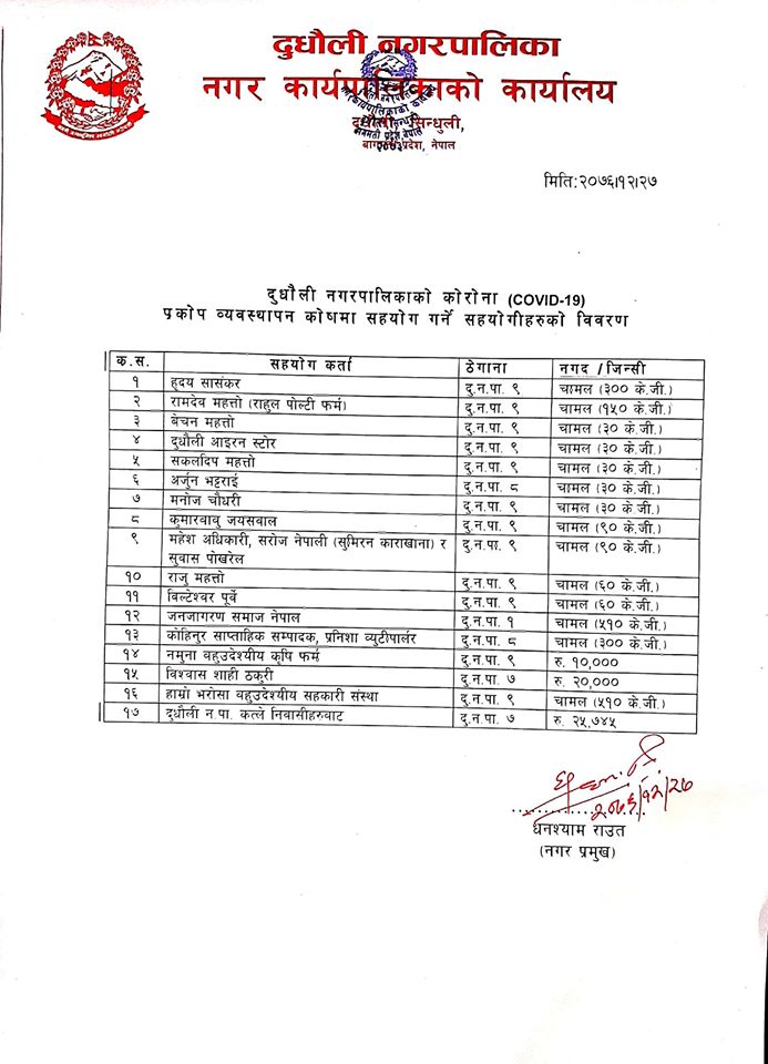 दुधौली नगरपालिकाको कोरोना (COVID-19) प्रकोप व्यवस्थापन कोषमा सहयोग गर्ने सहयोगीहरुको विवरण |